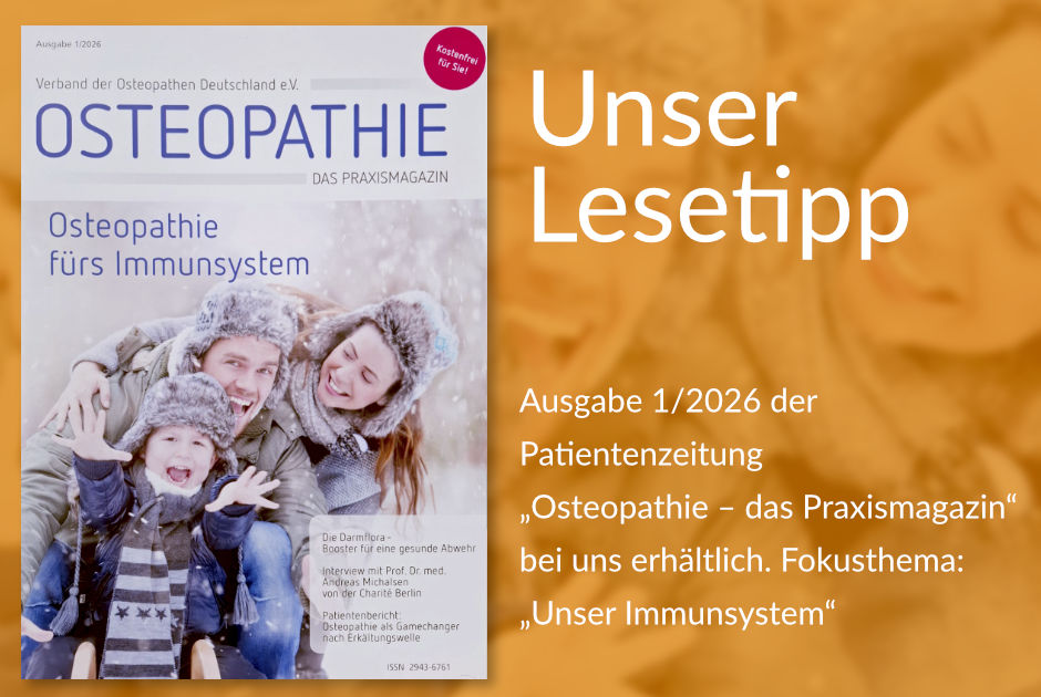 Das neue VOD-Patientenmagazin ist da und liegt bei uns aus. Das Fokusthema in dieser Ausgabe: Wie bleibt unser Körper widerstandsfähig – gerade in stressigen Zeiten? Die neue Ausgabe Patientenmagazins „Osteopathie – das Praxismagazin“ widmet sich dem Immunsystem und der Frage, wie osteopathische Ansätze die körpereigene Regulation unterstützen können.